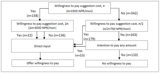 The initial suggested willingness to pay in the questionnaire, n, was set as 1500 NPR, the rounded average WTP value from the pilot test. The survey was structured according to the following logic in Figure 1.