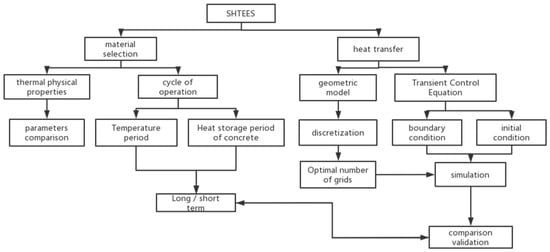 Concrete materials are an important part of the floor heat storage system, which were originally designed for architectural applications. Owing to their varying composition, the thermal and mechanical properties of concrete materials demonstrate diversified performance. They have also been widely used for industrial waste heat recovery in power plants [31,32]. In addition [33], TESs have been used to store the industrial waste heat to improve its utilization rate. Thus far, the research on concrete has increased its recyclability, greenness, and durability. For example, the physical properties of plastic wastes have been changed using chemical treatment or via their addition into concrete as aggregates. Some studies have proved that the compressive strength of concrete produced by this method reaches [34] MPa19. The choice of aggregate has evolved from natural ores to industrial and agricultural wastes, [35] such as construction demolition waste and agricultural waste, including coconut shells. Concrete with ground-granulated blast furnace slag exhibits more reliable thermodynamic properties than traditional concrete; thus, it can be used for heat storage. The study has revealed that adding straw fiber concrete to concrete with blast furnace slag improves physical properties [36,37]. In addition, the heat storage performance of concrete SHTESs is determined by studying the energy consumption of buildings [38]. An overview of the design method used for concrete SHTESs is shown in Figure 1.