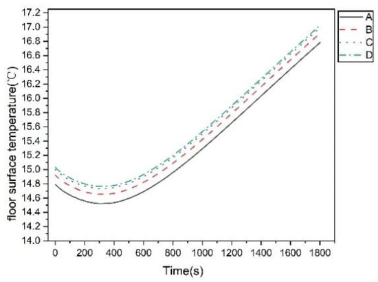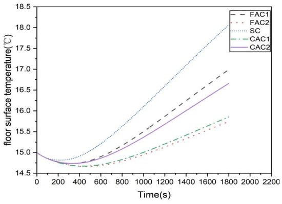 After simulating the working conditions of the five concrete filling layers, the floor surface temperature diagram after 30 min loading was obtained (Figure 6). In 200 s, the temperature shows a linear drop as the floor surface heat diffuses to the indoor environment. After 200 s, the temperature change curve becomes exponential. After 30 min of heating, the surface temperature of each concrete material differed according to its thermal performance. The floor surface temperatures are 16.9921°C, 15.7441°C, 18.0665°C, 15.8532°C, and 16.6585°C. In the case of constant coil temperature, the curve of the floor surface temperature with time indicates the heat gain capacity of concrete material inside the floor, and a steeper curve indicates that the material is sensitive to temperature change.