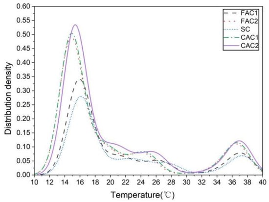 Figure 7 shows the distribution density of the internal floor temperatures for the five concrete materials, which was determined using a simulation based on the physical model and measuring points shown in Figure 5. The results at different measuring points were simulated to form a dataset by using distribution density plots of time and temperature that represent various types of concrete materials. Density plots show that the peak location of the temperature distribution within the time period is the most concentrated. When the coil temperature becomes constant, the heat stored in concrete per unit volume increases by one degree and the temperature inside the floor rises faster. The figure shows that the temperature mostly fluctuates between 14 °C and 16 °C. This is because the initial temperature of the floor is 15 °C and the concrete material has the characteristics of a temperature wave attenuation at the initial heating stage, resulting in a slow temperature rise rate. The temperature distribution of SC and FAC1 is uniform, with temperature ranging from 15 °C to 18 °C; this indicates that the amount of heat absorbed increases and the temperature changes quickly under these two working conditions.