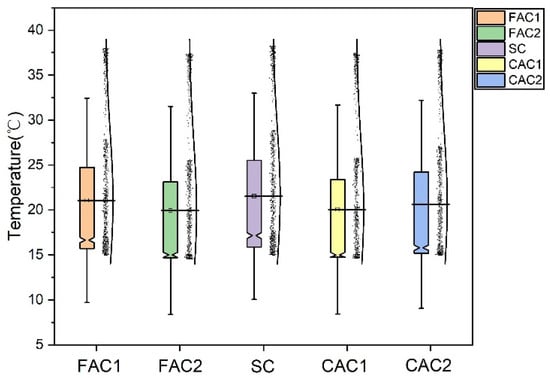To reduce the influence of uneven temperature, the heat storage capacity of concrete materials has been evaluated by utilizing the average temperature values in addition to the distribution density analysis. Figure 8 shows the boxplots of the internal floor temperatures for the five kinds of concrete materials. The beard line in the figure represents the standard deviation, the line in the box plot represents the average value, and the curve on the right is the normal distribution curve of discrete points. It can be found from the discrete data points that the data dispersion is large between 25 °C and 30 °C, and that the reason for the formation of both ends of temperature is closely related to the heating time. Therefore, the average values were used to reduce the inhomogeneity of temperature distribution. The average values of each group were between 20 °C and 22 °C, and the highest values of FAC1 and SC groups were 21.02 °C and 21.52 °C, respectively. However, the large standard deviation indicates that the data points are significantly different from the average value at this time; thus, the further analysis of concrete heat storage is needed.