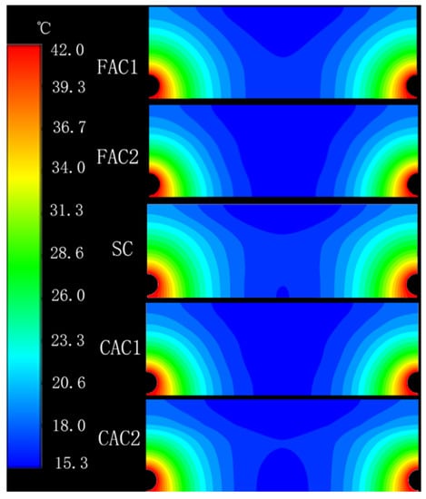 Figure 9 shows the internal temperature map of the floor after heating for 30 min, which highlights the static temperature field inside the floor. The scale on the left represents the accuracy of the temperature with the help of various colors. As the temperature inside the floor (shown in the picture) is in the early stage of heating, the temperature mostly lies in the blue part of the scale (15.3 °C to 18 °C). The uneven temperature distribution can reduce the heat storage efficiency of concrete materials. The temperatures associated with FAC2 and CAC1 generally lie in the dark blue part of the scale, while those associated with SC rarely lie in the dark blue part. In this stage, the SC floor exhibits a high heat transfer efficiency and rapid temperature change.