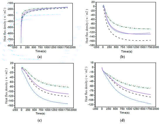 Heat flux density of the floor in different sections: (a) section 1 (at 20 mm), (b) section 2 (at 40 mm), (c) section 3 (at 50 mm), and (d) section 4 (at 60 mm).