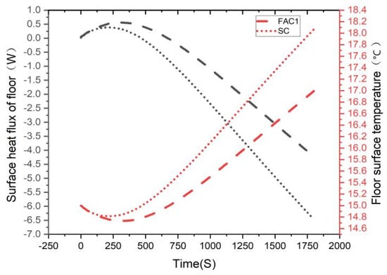 To study the influence of thermal conductivity on heat storage capacity, a dataset with different thermal conductivities and other variables has been selected for analysis; FAC1 and SC are used to analyze the floor surface temperature and floor surface heat flow (Figure 11). After the floor system started its operation, the heat flow and temperature of the floor surface exhibit an opposite trend, indicating that the direction of heat flow is opposite to the direction of temperature gradient for isotropic materials. The figure defines heat inflow as negative and heat outflow as positive. SC exhibits a high thermal conductivity, and the temperature and heat flow of the floor surface change quickly. However, the heat outflow from the floor surface of FAC1 reached its peak before 500 s, indicating that the heat transfer rate of the FAC1 floor interior was lower compared to that of the SC floor interior in the same period of time; therefore, heat did not transfer to the floor surface. At this time, the temperature of the FAC1 floor surface dropped rapidly. After 500 s, the temperature of the FAC1 floor surface rises gradually and the heat flow into the floor surface increases, indicating that the internal heat is transferred to the floor surface only after more heat is absorbed inside the floor. Because this coefficient of thermal conductivity is smaller, the quantity of the heat that passes inside the unit time is less; thus, the quantity of heat transferred to the floor surface is minimal.