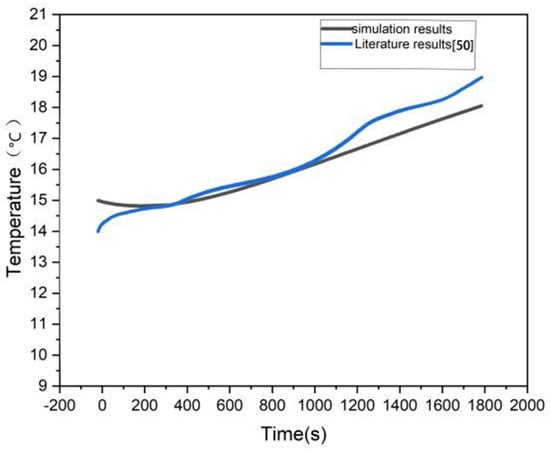 Based on the floor surface temperature, a comparative analysis has been conducted with related literature in this study. Table 3 lists the floors similar to those used in this study through literature sorting, and the analysis results are shown in Figure 12. As can be observed from the figure, the simulation results exhibit the same general trend that is observed in the literature sorting results. After 900 s, both the datasets show an increasing trend with an increase in heating time; the average difference in floor surface temperature is 0.57 °C, and the maximum difference in plate temperature is 1.8 °C. The literature data are higher than the simulation data in this study. Although the heating temperature and initial temperature of the coil in the literature are slightly lower than that in this study, the coil spacing is half of that in this study, indicating that the floor heating rate increases with a decrease in the coil spacing. Therefore, the error between the results of the simulation method and the results of literature sorting is less than 5%, which can be regarded as accurate.