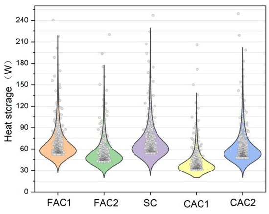 The instantaneous heat storage inside the floor can be calculated using the heat storage formula (Figure 13). The instantaneous heat storage exhibits the following descending order: SC, FAC1, CAC2, FAC2, and CAC1. As the heat storage capacity increases, temperature changes quickly; thus, the primary factor is the heat flux density of the floor surface. The simulation performance for heat flux density is better than that for the instantaneous heat flux. In addition, the working conditions of the heat storage under different periods and temperatures reflect the heat storage capacity of the floor, thus affecting the change in the instantaneous heat storage; a rise in the internal temperature of the floor increases the heat storage capacity, which leads to the complete heat absorption.
