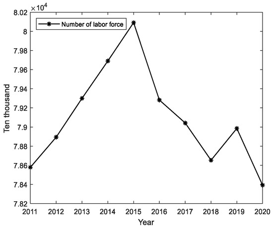 To judge the existence and stability of the numerical solution, we first calibrate the parameters. As China is labor intensive, the labor income share is lower than that of developed countries. The share of capital income in developed countries is generally taken, (see literature [22,33,34] for details), so we set the capital income share as according to [35].