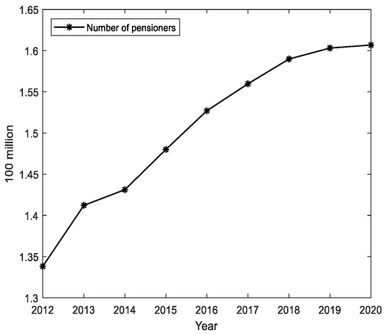 The increasing age of the population has led to a rise in the old-age dependency ratio (Figure 1 and Figure 2). This demographic change has led to a gradual decrease in the number of people contributing to pension insurance relative to the number of pension recipients, putting enormous financial pressure on the pay-as-you-go (PAYG) social security system [3], while the coverage of pensions in China is continuing to expand (Figure 3 and Figure 4). Based on the current trend, according to the China Pension Fund Actuarial Report 2019–2050, the accumulated balance of the basic pension insurance fund for urban employees nationwide will peak in 2027 and be depleted in 2035, then begin to run a deficit [4]. Furthermore, the average age of pensioners in China now is nevertheless lower than 55 years [5]. Therefore, the growing pension expenditure gap, the gradually increasing number of the elderly population, the increasing pressure of pension payments, and the severely insufficient pension fund income will lead to the inevitable trend of pension policy reform. Due to enforceability of the policy, sustainability of the financial input, and the rigid characteristics of benefits, the delayed retirement policy becomes an inevitable choice of the government. The Ministry of Human Resources and Social Security has already proposed suggestions that men’s retirement age should be raised by one year every six years, and women’s retirement age should be raised by one year every three years, so that the goal of retirement at age 65 for both men and women can be roughly achieved by 2045. In addition, whether delayed retirement can bring a certain degree of welfare improvement to delayed retirees is also an important determinant of whether this policy can really be implemented effectively.