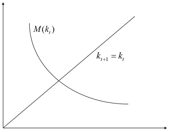 From Equations (18), (23), and (27), we can know that the solution of equations only depends on the parameters; once the parameters are given, the solution is constant. The function of capital-labor ratio is denoted on the right of Equations (18), (23), and (27) as . After calibration and from the image method (Figure 7), we know that , , exist, i.e., Equations (19), (24), and (28) all have equilibrium solutions. The existence, as well as the stability of equilibrium solutions, are mentioned and explained in [24,33].