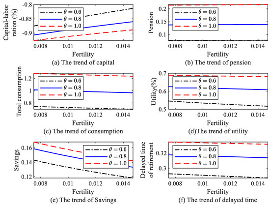 In addition, comparing Figure 8b,e, we know that the increases in the amount of pension received in steady-state after delaying retirement promotes individuals to save more. Of course, the income effect gradually decreases due to an increase in the birth rate, which finally leads to a gradual decrease in this promotion effect.