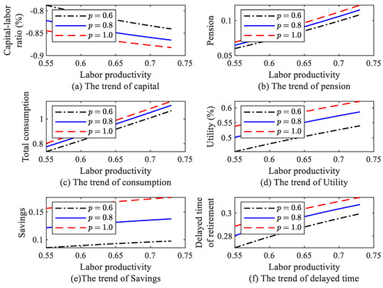 In Figure 11, the black dotted line, the blue solid line, and the red short line indicate the changes in each steady-state variable of voluntary delayed retirement relative to normal retirement for labor productivity , and , respectively.