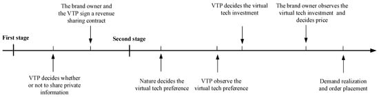(1) In the first stage, the VTP decides whether to share his private information with the brand owner, before observing the preference information. We explore two information-sharing formats: no information sharing and information sharing. The first format is “no information sharing”, which occurs when the virtual technology platform ex ante commits to not sharing the consumer virtual technology preference. The second format is “information sharing”, in which the virtual technology platform promises to reveal the true information after obtaining it, and the brand owner adjusts their pricing plan accordingly. Then, the brand owner and the VTP sign a revenue-sharing contract. We assume that the revenue-sharing contract is determined in the first stage. Note that the VTP often takes time to build virtual spaces and test products before entering new markets, and the VTP expands into Metaverse markets with well-developed products (Li et al. [29]).
