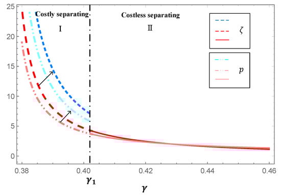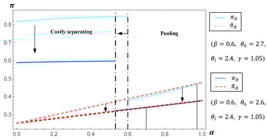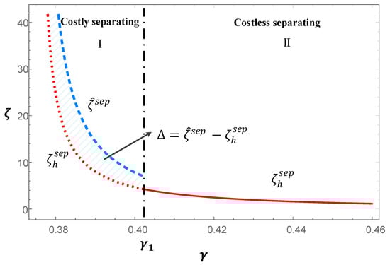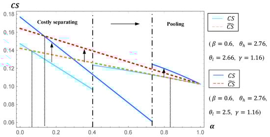 The last inequality holds if and only if . When , the h-type VTP has to distort up the virtual technology investment. Thus, they fail to achieve the maximum profit that they can gain from the information symmetry scenario. The h-type VTP’s profit loss owing to distorting up the virtual technology investment is a signaling cost, and it is referred to as costly separating.