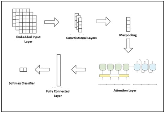 The proposed research goal developed an intelligent model, incorporating automated lexical analysis techniques of online customer reviews. Lexical analysis, the deep learning (DL) model, and the attention model are employed to enhance the performance of prediction. The DL-DA model extracts lexical features from consumer reviews (concerning the satisfaction and the willingness to repurchase green and sustainable products). Then, DL is utilized to learn the main lexical and context attributes from the reviews and employ the attention model as a scoring scheme. The last stage classifies the scored lexical attributes. The proposed model has five layers: an embedded input layer, a convolutional deep layer, a Maxpooling layer, a dual attention layer, and fully connected layer followed by the Softmax classifier. The model is depicted in Figure 1.