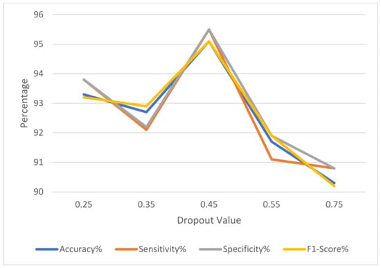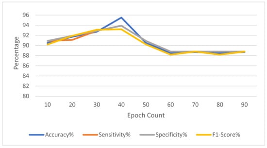 The experiment performance metrics are accuracy, sensitivity, specificity, and F1-score, which are the most used metrics in performance studies.