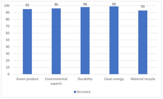 We performed extensive experiments to test our model and evaluate its performance for the lexical analysis process. Table 3 depicts the lexicons extracted from online surveys answered by buyers of green products. The topics in Table 3 are green product, environmental aspects, durability, clean energy, and material recycling. Many lexicons are extracted from consumer surveys. Lexicons include green, plastic use, durable, recycling, and clean energy, among other lexicons. From these surveys, we selected important lexicons that matter to sustainability to extract from consumer reviews about products.