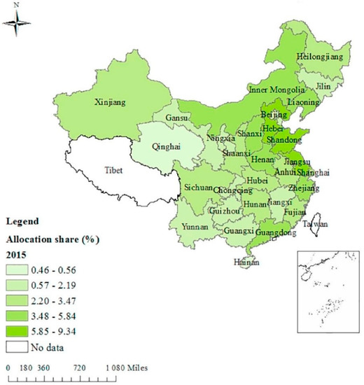 Carbon emission quota shares for Chinese Provinces in 2015 (Source: [15]).