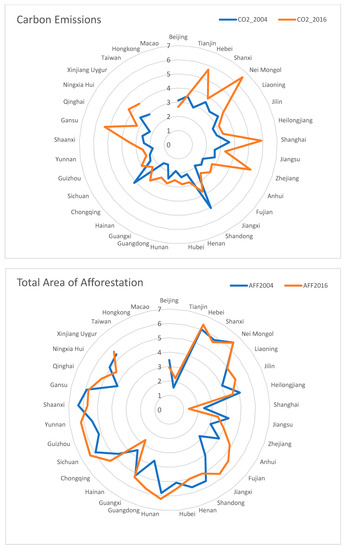 In this article, Area of Forested Land (AOF), Forest coverage rate (FCR), Forest Investment (FI) and Total Area of Afforestation (AFF) are considered as the main explanatory variables that are related to forestry. The data on the energy consumption and forest indicators are drawn from the National Bureau of Statistics of China (Data on energy sources and consumption are available at http://data.stats.gov.cn, accessed on 5 September 2019). In empirical estimations, we use per capita GDP, urbanization, and coal and oil consumption as control variables. The data on control variables are gathered from the China Statistical Yearbook. The GDP data are normalized to constant price (Chinese Yuan (CNY)). Table 1 reports the definition of variables, unit of measurement and data source of all variables used in the empirical models, while, Table 2 documents the descriptive statistics for our variables. In addition, the radar map in Figure 2 mentions that the studied variables have diversity across Chinese provinces.