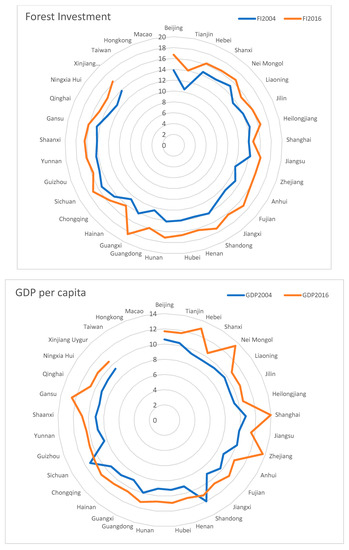 where denotes forestry variables for province at time , and are assumed to be fixed province-specific effects. The observations in Equation (2) are available in the 30 contiguous provinces from 2004–2016, so that and .