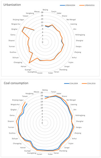 Furthermore, the distribution of Chinese provinces exhibits regional dynamic characteristics that vary across clusters. For instance, in 2004, the provinces in the H–H group and L–L groups were 9 and 9, respectively. The facts of 2004 show that the H–H and L–L groups were 54.55% of all Chinese provinces. On the contrary, we note that 45.45% of all provinces are in the other two groups (H–L and L–H). Such facts mainly imply that there was a dual structure in the spatial distribution of per capita CO2 emissions in Chinese provinces in 2004. We further observe that in 2016, the number of H–H and L–L provinces had decreased by 4 and 9, respectively. The mentioned findings suggest that the spatial agglomeration of CO2 emissions had decreased in the studied period from 2004 to 2016. From these results, we can draw the conclusion that the pattern of evolution of CO2 emissions in Chinese provinces shows a certain path dependency effect.