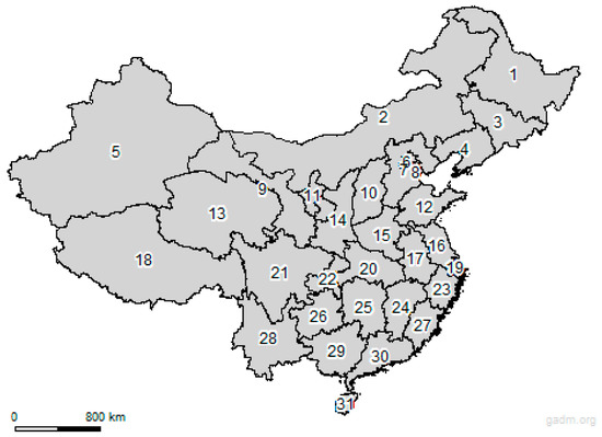 The unique identification code for each province is indicated by the number column. Moreover, the name of each province is represented by the province column. In addition, the province code adjacent to each province is indicated by the adjacent province code field. Furthermore, the spatial weighting matrix indicates that the distance between neighboring provinces is 1, while the distance between non-neighboring provinces is 0. Figure 3 illustrates a map of Chinese provinces and their corresponding numbers as per Table 6.
