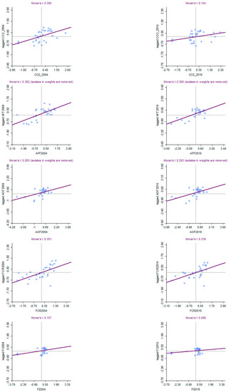 The global Moran’s I index reflects the overall distribution of spatial observations. The term “global” indicates that a single value for the index is generated for the whole pattern. Therefore, we cannot map the Global Moran’s I. Consequently, we use the Moran’s I scatter plot to visualize the spatial autocorrelation of variables. To save space, we only conduct a Moran’s I scatterplot of both environmental and forestry variables across Chinese provinces for the years 2004 and 2016 (see Figure 4). A visual inspection of Figure 4 confirms the previous results of the global Moran’s I and indicates the existence of spatial dependence for per capita CO2 emission concentrations across Chinese provinces. Furthermore, the overall pattern of spatial dependence was also verified for forest variables.