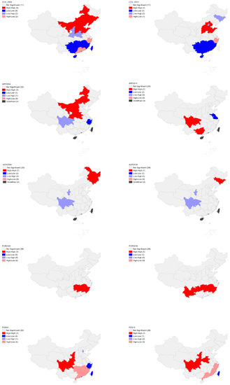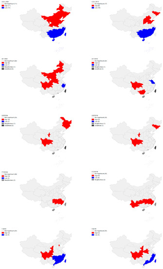 The spatial autocorrelation is used to examine the local similarities and differences across neighboring provinces [66]. The local Moran’s I statistic is reported as: