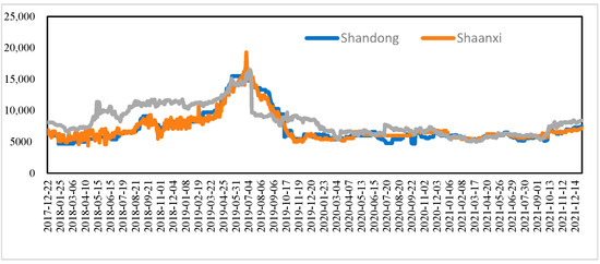 Table 1 reports the descriptive statistics; , and are prices of future market, Shandong and Shananxi spot markets. The average, maximum and minimum of futures prices are 8330, 16,500 and 4988, respectively. The average prices in the Shandong and Shaanxi spot market are 6000 and 6400, and the correlation coefficients with futures prices are 0.8164 and 0.8453. It is preliminarily judged that the apple futures market and the spot markets have a correlation above a medium level.