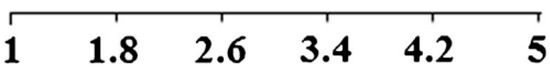 SPSS 26.00 was used to perform the statistical exams. To examine the level of DC beliefs, the mean score of each component was compared with critical scores: The “good DC beliefs score” and the “normal DC beliefs score.” The good DC beliefs score was computed by dividing 4 (4 units between 1, the smallest score given for any item, and 5, the greatest score given for the item) by 5 that represented 5 levels, getting 0.80. Thus, we obtained the points related to the DC beliefs intervals presented in Figure 1. The two middle points (2.6 and 3.4) represented the “normal DC beliefs score” and the “good DC beliefs score” respectively. Moreover, the point 4.2 represented the “very good DC beliefs score.” Our use of these critical scores and the associated one sample t-test follows other educational studies [39].
