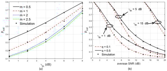 Figure 5. Outage Probability under Nakagami-mNakagami-q fading for (a) fading parameter m = 0.5, 1, 2, 2.5 and (b) Fading parameter q = 0.1, 0.5; γ t h = 1 dB, 5 dB, 15 dB.
