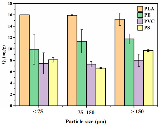 The particle size of microplastics has significant influence on the adsorption affinity [15,16,20]. After grinding and sieving, the particle size of microplastics was divided from 75 μm to 150 μm (75–150 μm account for 70% among them). The particle sizes distribution of PLA, PE, PVC and PS are shown in Figure S1. The effect of microplastic particle size on the TCS adsorption process was investigated at the initial concentration of TCS of 8 mg L−1. The results in this experiment showed that the adsorption capacity of PLA with different particle size was higher than that of PE, PVC and PS, which revealed that PLA was a stronger carrier for TCS. With the increase of particle size, the Qt value nearly remained the same. The influence of particle sizes on adsorption capacity was not obvious (Figure 1). The adsorption properties of microplastics increased with the decrease in particle size have been found in previous studies [14,21]. The inconsistent results might be attributed to the different particle sizes used in this experiment.