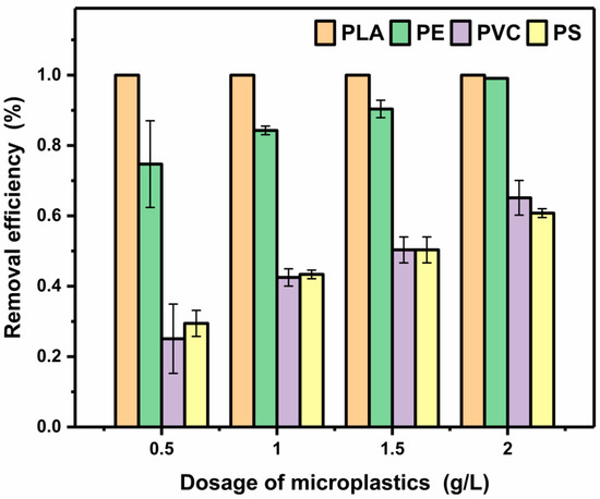 The additive amount of microplastics is also a critical influence factor for TCS adsorption processes. Subsequently, the influence of microplastics dosage on the adsorption of TCS was studied. As shown in Figure 2, TCS was completely removed from the solution in which PLA was added, and the removal efficiency (η) remained at 100% with the increased dosage of PLA from 0.5 g/L to 2 g/L. For PE, PVC and PS, the η of TCS increased with the increase of microplastics dosage, respectively. Among them, the η of PE is above 75%. The removal efficiencies of the PVC and PS are similar, ranging from 30% to 60%. When the microplastics dosage is low, TCS can completely occupy the adsorption site on the surface of microplastics. The increase of adding dosage can contribute to a substantial increase of the removal efficiency by providing more available adsorption sites [15,22,23,24].