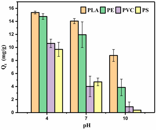 The effect of pH on the adsorption of TCS by PLA, PE, PVC and PS was shown in Figure 3, and the adsorption capacity of the TCS decreased as pH increased. Under different pH conditions, changes in both the physio-chemical properties of TCS and the surface charge of microplastics lead to the change of adsorption performance [18,25]. On the one hand, as an ionizable organic chemical, the dissociation of TCS molecules can be affected by the pH value. The distribution of dissociated and non-dissociated species of TCS with pH values is represented in Figure S2. The dissociation constant (pKa) of TCS is 8.14, when pH < pKa, TCS is mainly distributed in solution in non-dissociated form in solution; whereas when pH > pKa, the dissociated species (anions) is dominant. On the other hand, regarding microplastics, the surface functional groups are deprotonated when the solution pH is higher than the pHpzc of the four microplastics. Therefore, the microplastics surface is negatively charged at solution pH > pHpzc [23,25,26]. The point of zero charge (PZC) was determined by the titration method proposed by Tripathy et al. (measurement method see Supplementary Materials) [27]. The pHpzc of PLA, PE, PVC and PS is 7.3, 7.0, 7.4 and 7.2, respectively. The surface of the microplastics and TCS molecules became more negatively charged with the increase of solution pH. The primary interaction between TCS and the surface of microplastics is electrostatic repulsion, which hinders the adsorption of TCS with negative charges. The results indirectly indicated that the electrostatic interaction plays a vital part in the potential of microplastics as a vector for TCS.