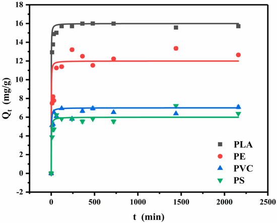 The adsorption kinetics of TCS on PLA, PE, PVC and PS are presented in Figure 5. From the viewpoint of the overall adsorption procedure, the adsorption TCS was rapid in the initial stage with large accessible active sites on microplastics, and then gradually reached adsorption equilibrium with binding sites occupied and the equilibrium time of 24 h. In order to pursue the rate-limiting mechanisms of TCS adsorption on PLA, PE, PVC and PS, the kinetics for adsorption were described by the pseudo-first order and pseudo-second order model, and the dynamic parameters were listed in Table 1. The calculated Qe values follow an order of PLA > PE > PVC > PS, which is in accordance with the experimental results. Therefore, the results manifested that the adsorption of TCS was significantly influenced by the characteristics of biodegradable and non-biodegradable microplastics. The coefficient (R2) of the pseudo-second order model for PLA, PE, PVC and PS was larger than that of the pseudo-first order model, respectively. Moreover, there was a close agreement between the experimentally measured Qe values and the calculated Qe values obtained from the pseudo-second order model. Based on the above analysis, the pseudo-second order model was more suitable for fitting the TCS kinetic process. A similar result has been found in Li et al.’s [21] investigation of the diclofenac adsorption by PS. The adsorption kinetics of TCS onto PLA, PE, PVC and PS indicated that chemical force was the main controlling element, and chemisorption was the dominating rate-limiting step.