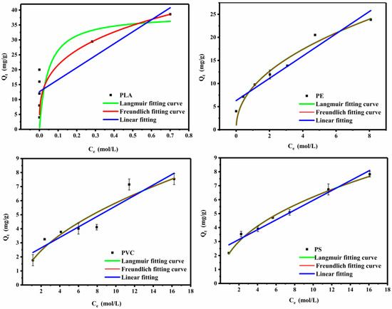 To further understand the adsorption behavior and mechanisms, the Freundlich isotherm model, Langmuir isotherm model and linear isotherm model for TCS adsorption on PLA, PE, PVC and PS were fitted and shown in Figure 6. The obtained parameters were given in Table 2. As can be seen from Table 2, the Freundlich model gave the highest R2 values (0.999) for TCS adsorption on PLA, indicating that the heterogeneous chemisorption adsorption might be predominant. The monomolecular adsorption was possibly due to the homogeneous specific adsorption site. The results were consistent with previous reports by Hüffer and Hofmann [29]. The Freundlich model and linear model were fitted well with the PE, PVC and PS adsorption data, which illustrated that the adsorption of TCS by PE, PVC and PS was dominated by the monolayer and multilayer coverage. A similar conclusion was found by Chen et al. and Yu et al. [30,31].
