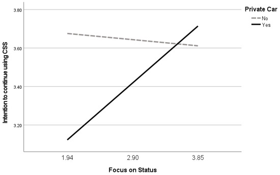 For users who did not own a private car, a higher emphasis on status indicated a lower intention to continue using CSS, but this effect was offset by the significant interaction between the presence of a private car and emphasis on status, confirming that for users who owned a private car, a higher emphasis on status indicated a higher intention to continue using CSS than for users who did not own a private car. Hypothesis 4 was therefore supported.