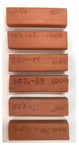 - Rodrigues, D.V.; Xavier, G.C.; Saboya, F.; Maia, P.C.; Alexandre, J. Durabilidade de peças cerâmicas vermelhas com adição de rejeito de rocha ornamental isenta de granalha. Cerâmica 2012, 58, 286–293. [Google Scholar] [CrossRef][Green Version]