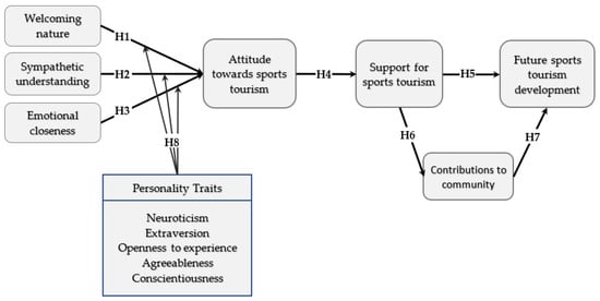 As SET suggests, social exchange will not occur if neither of the two individuals receives adequate rewards. The assessment of the benefits of the exchange is affected by an individual’s emotions, which SET fails to consider [41]. Furthermore, the emotions experienced in the exchange process affect the differing perception of the individual’s present and future interactions [42]. In tourism, there is an existing complex relationship between tourists and residents that SET fails to capture [41]. Hence, Woosnam and Norman [43] utilized Durkheim’s theoretical framework of emotional solidarity to measure the significance of residents’ attitudes towards tourism by developing an emotional solidarity scale. Concurrently, emotional solidarity has been adopted in the tourism literature to evaluate the level of familiarity or closeness between residents and tourists (e.g., [44,45,46]). Thus, a close examination of the attitude of residents towards local support for tourism development is of critical importance, especially in an emerging type of tourism (i.e., sports tourism). This relationship has already been established by Woosnam [47]. However, relying on emotional solidarity alone may pose a challenge in explaining the relationship between the residents’ emotional solidarity with their support for sports tourism and future development. Thus, Erul et al. [46] considered the supporting effect of the Big Five personality traits on the relationship between emotional solidarity and support for tourism development. As a result, a complete understanding of the residents’ attitude and level of support is achieved. However, no work has yet to integrate this effect of the Big Five personality traits into the local support for sports tourism.