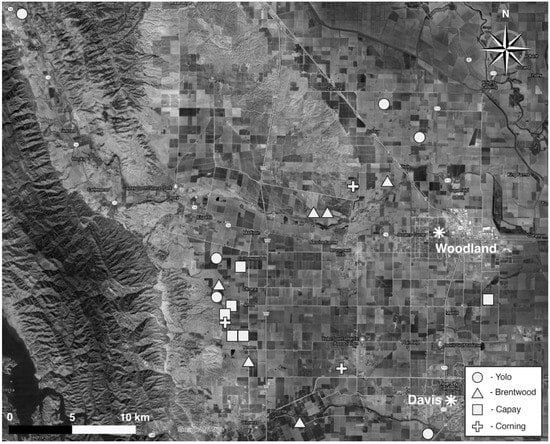A regional survey was conducted across farms in the mostly leveled, lowland alluvial plains, fans, and terraces of Yolo County (Figure 1), situated in the southern Sacramento Valley, California, USA. Sites ranged in elevation from 16 to 140 m above sea level. The 92,463 ha region is characterized by cool, wet winters and hot, dry summers that engender a xeric soil moisture regime and a thermic soil temperature regime [52]. Annual precipitation is 52.6 cm and mean annual temperature of 17 °C, based on the city of Woodland, CA. Soils are developed largely from materials deposited from the Coast Range mountains to the west.