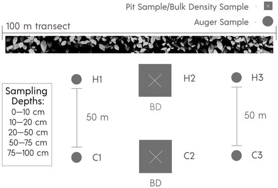 where Ci is the total mass of SOC (kg m−2) for sampling depth i, BD is the bulk density (kg m−3) of sampling depth i, di is the length (m) of sampling depth i, and ci is the concentration of SOC (g kg−1 soil) for sampling depth i. Profile SOC stocks (0–100 cm) were calculated by summing the total SOC (kg m−2) from each individual soil depth [66]. Weighted averages of measured SOC (used in principal component analysis) at 0–10 cm and 10–20 cm depths were used for 0–20 cm SOC stock values and at 20–50 cm, 50–75 cm, and 75–100 cm for 20–100 cm SOC stock values: