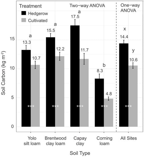 When analyzed by depth increments (Table 2; Figure S1), SOC concentrations (g kg−1) and SOC stocks (kg m−2) were significantly higher under hedgerows at all depths and across all soil types, except at 10–20 cm and 20–50 cm in Yolo (concentrations only) and Brentwood. At 0–10 cm, SOC in hedgerows was nearly double that of cultivated fields across soil types, likely due to both increased organic inputs and decreased decomposition. Hedgerows have been shown to increase litter deposition [31,78,79] and prevalence and turnover of fine roots [80,81].
