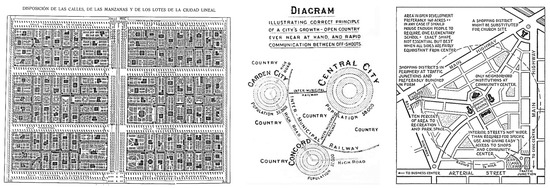 Comparison between Lineal City, Garden City, and Neighbourhood Unit, from left to right. Lineal City Source: [37]. Garden City source: [41]. Neighbourhood Unit source: [43]. Translation for the Lineal City image “Placing of the streets, blocks and urban lots in the Lineal City”.