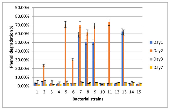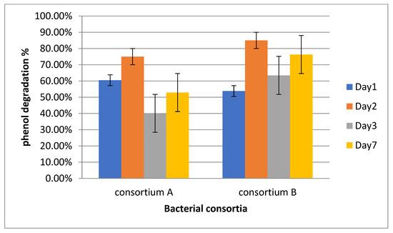 Individual bacterial isolates showed a high affinity for phenol biodegradation. However, strain nos. 11, 5, 7, 9, 8, and 13 showed the highest promising results with a degradation percentage that reached 75% with strain 11 (Figure 2). Consortium A (composed of equal volumes of the six most promising isolates numbered 5, 7, 8, 9, 11, and 13) was compared with consortium B (consisting of equal volumes of all the fifteen isolated bacterial strains) (OD600 nm ≈ 1.00 ± 0.40 was prepared by mixing the purified isolates to a final concentration of 10.0% (v/v)). The results showed that consortium B was more efficient at phenol biodegradation, reaching 85% after 48 h incubation (Figure 3). The results of the present work were highly promising compared with that proposed by Ammeri et al. [18], who showed that the phenol degradation by bacterial consortia B1 and B2, respectively (B1 contained Citrobacter freundii, Klebsiella variicola, Staphylococcus equorum, and Micrococcus lylae, and B2 contained Leclercia adecarboxylata, Leclercia adecarboxylata, Klebsiella sp., and Klebsiella oxytoca) isolated from petroleum refineries in Egypt were 62.2 and 85.5%, respectively.