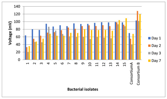 Bacterial isolates were tested for their bioelectricity generation capacity, both individually and in consortia A and B (mentioned above). The voltage was recorded through the MFC using the voltmeter, whereas the power density was calculated using Equation (4), knowing that the net anodic chamber volume was 80 mL. Bacterial isolate no. 15 showed the maximum bioelectricity generation after 7 days of incubation, followed by isolate no. 14, with cell voltages of 109 and 104 mV, respectively (Figure 4). On the other hand, consortium B showed the most promising results by generating 128 mV after 48 h, while consortium A showed inferior results across all time intervals. Similarly, Naik et al. [19] reported that bioelectricity generation occurred in response to phenol degradation when using a microbial biofilm that had been isolated from wastewater.