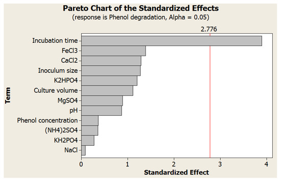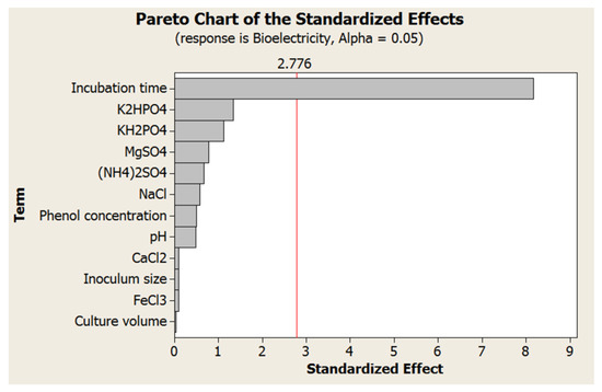 Some variables, namely, incubation time, FeCl3, and CaCl2, were found to be the most significant for phenol biodegradation. On the other hand, incubation time, K2HPO4, and KH2PO4 were found to be significant for bioelectricity generation, which was further confirmed using Pareto charts (Figure 6 and Figure 7). Therefore, incubation time, K2HPO4, KH2PO4, FeCl3, and CaCl2 were selected for further optimization at five coded levels (−2, −1, 0, 1, 2) for a deeper analysis of the whole process using consortium B by applying a CCD, as they were confirmed to have a tremendous effect on both the phenol biodegradation and bioelectricity generation.