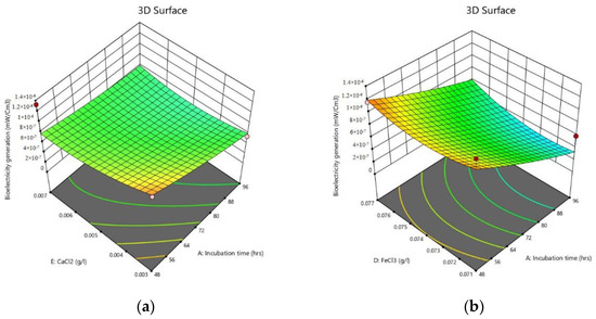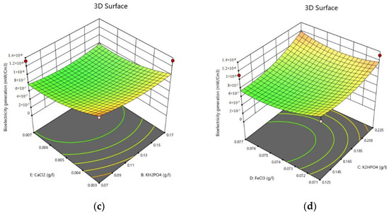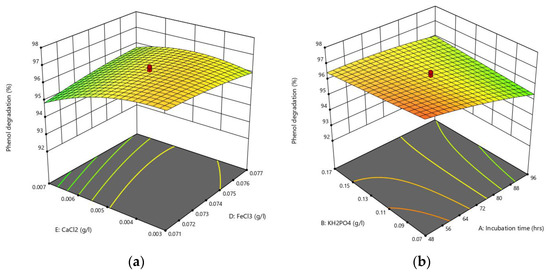 Phenol degradation and bioelectricity generation (Table 7) as responses for variations in parameters, namely, incubation time (x1), KH2PO4 (x2), K2HPO4 (x3), FeCl3 (x4), and CaCl2 (x5), were obtained using Design Expert 12.0®. The results of the second-order response surface model fitting in the form of an analysis of variance (ANOVA) were calculated (Table 8). The significance of each coefficient in Equations (10) and (11) for the phenol degradation and bioelectricity generation, respectively, was determined using Fisher’s F-test and p-values. The linear effects of incubation time and CaCl2, as well as the quadratic effect of CaCl2, on the phenol biodegradation were significant. Moreover, the interaction effects of “incubation time and KH2PO4” and “FeCl3 and CaCl2” were found to be significant (p ≤ 0.05). On the other hand, for the bioelectricity generation, the linear and quadratic effects of incubation time were significant, as well as the quadratic effects of KH2PO4, K2HPO4, FeCl3, and CaCl2. The interaction effect of incubation time and CaCl2 was significant (p ≤ 0.05). The remaining interaction terms were insignificant (p > 0.05).