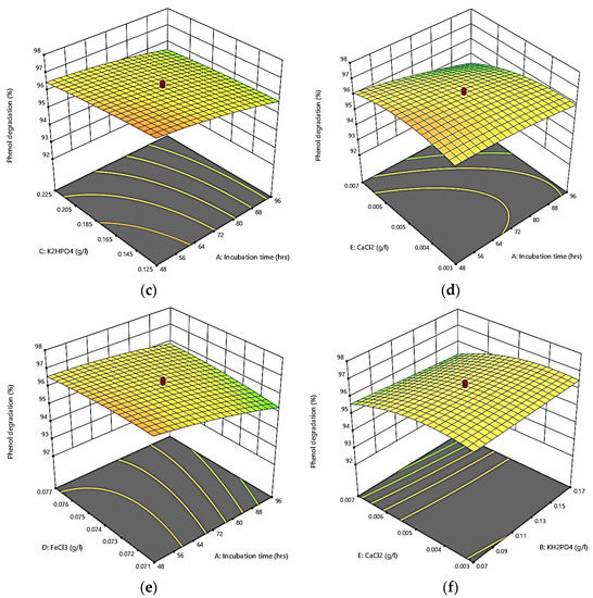 Three-dimensional surface plots for the effects of the tested parameter interactions that led to the maximum phenol degradation (R1): CaCl2 and FeCl3 (a), incubation time and KH2PO4 (b), incubation time and K2HPO4 (c), incubation time and CaCl2 (d), incubation time and FeCl3 (e), and KH2PO4 and CaCl2 (f).