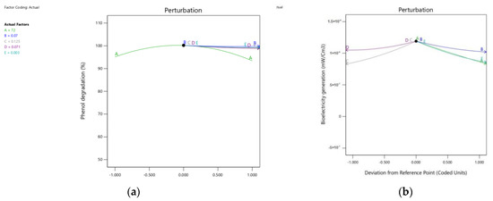 Perturbation curve showing the exact optimal values of the tested parameters and predicted phenol degradation (a) and bioelectricity generation (b).