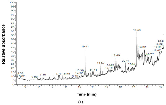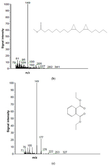 A cell-free extract of the medium after fermentation with consortium B was subjected to GC-MS analysis. The MS spectrum after the biological treatment with bacterial consortium B indicated that the major components were trans-cyclopropaneoctanoic-2-[(2-pentylcyclopropyl)-methyl-ester and diethyl phthalate (Figure 11a–c). According to WHO, the present phenol degradation products are non-toxic and safe for environmental and pharmacological use.