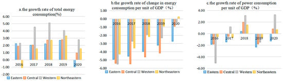 Fourth, the circular economy in the eastern regions has a more prosperous trend than it does in the other regions. As a new mode of economic development, the circular economy is an inevitable choice to achieve sustainable development. The growth rate of change in total energy consumption, energy consumption per unit of GDP, and power consumption per unit of GDP in the eastern region have all shown a downward trend, forming a relatively green and low-carbon development trend. The economic system has an inhibitory effect, which is not conducive to the region’s sustainable development.